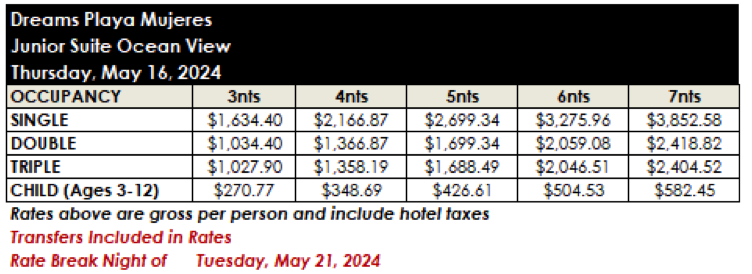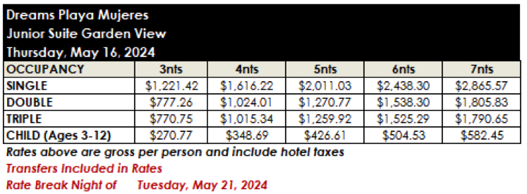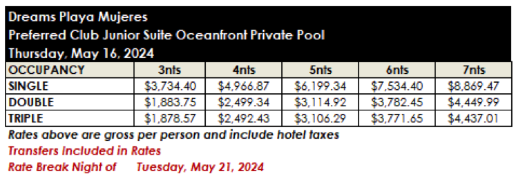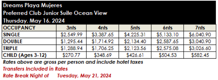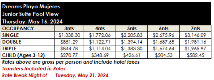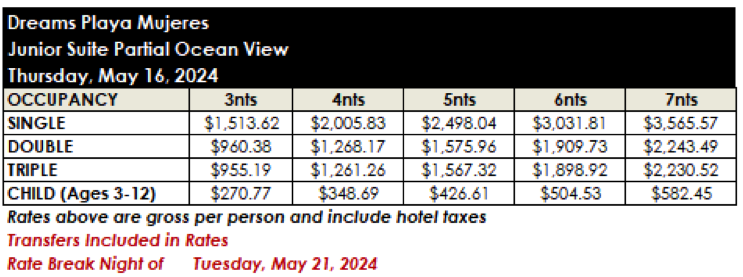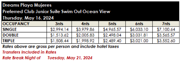ROOM RATES FOR DREAMS PLAYA MUJERES